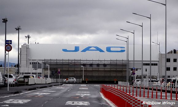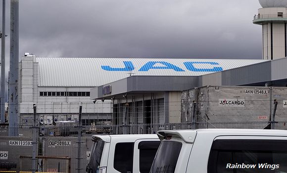 ターミナルビルから見える格納庫の屋根に描かれた、大きなJACの文字。 2013年12月18日 |