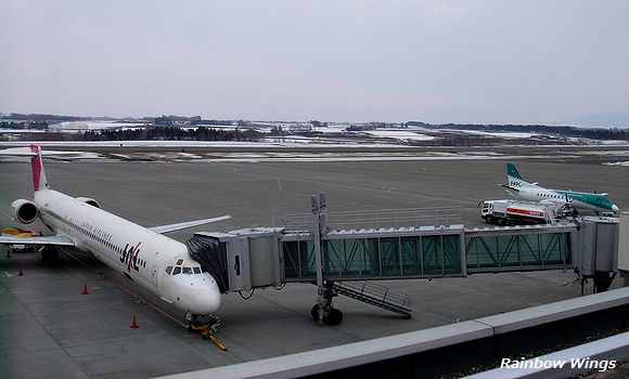 新千歳行 MD-81と、羽田行 MD-90[1号機]の出会い。 1996年4月27日 女満別空港にて |