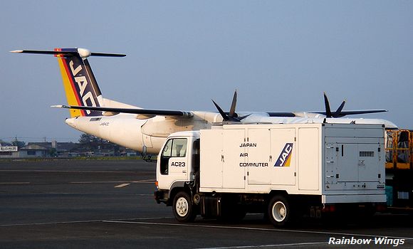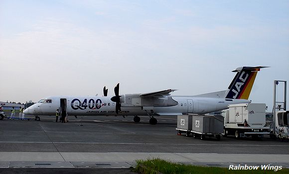 宮崎空港を旅立とうとした直前、レインボーカラーのQ400が飛来。 2012年5月23日 |